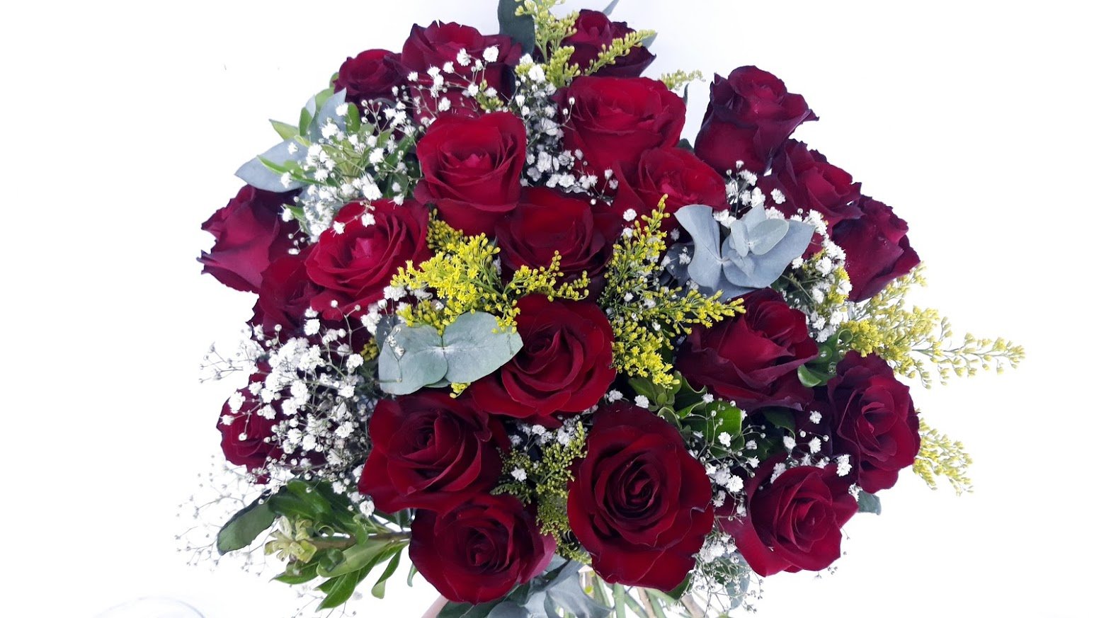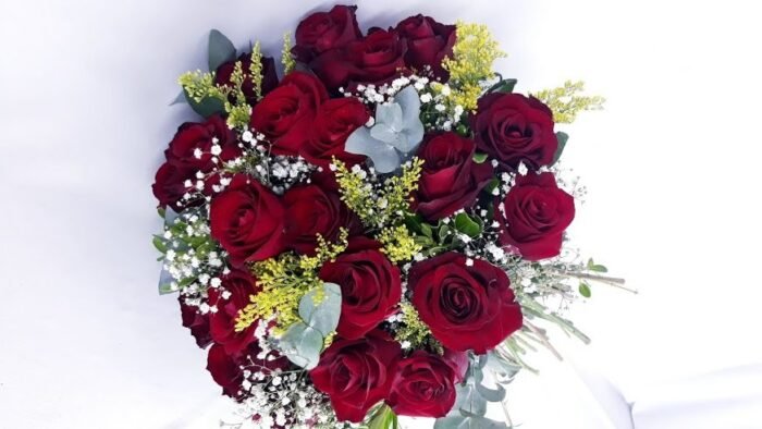 Buquê com 24 lindas rosas vermelhas nacionais envolvidas com verdes, tango e gypsophila.